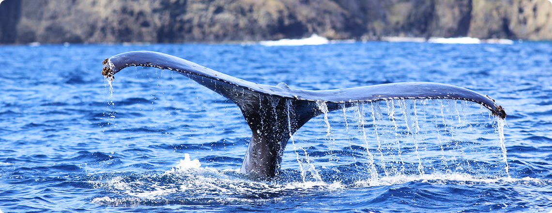 小笠原の冬の訪れを知らせるてくれるザトウクジラ。小笠原はホエールウォッチング発祥の地であり、見える数も日本一!!